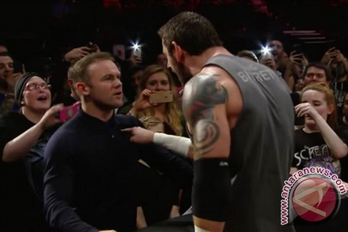 London, (ANTARA/AFP) - Kapten Manchester United Wayne Rooney mencuri perhatian pada ajang World Wrestling Entertainment (WWE), dengan "menampar" pegulat yang mendorongnya di pinggir ring.