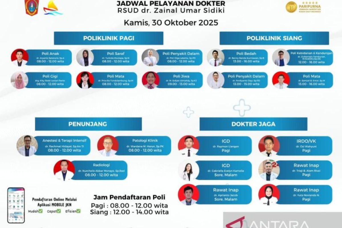Gorontalo (ANTARA) - Rumah Sakit Umum Daerah (RSUD) Zainal Umar Sidiki (ZUS) Gorontalo Utara, Provinsi Gorontalo membuka layanan poliklinik Penyakit Dalam, sepanjang hari Kamis setiap pekan termasuk pada 30 Oktober 2025.