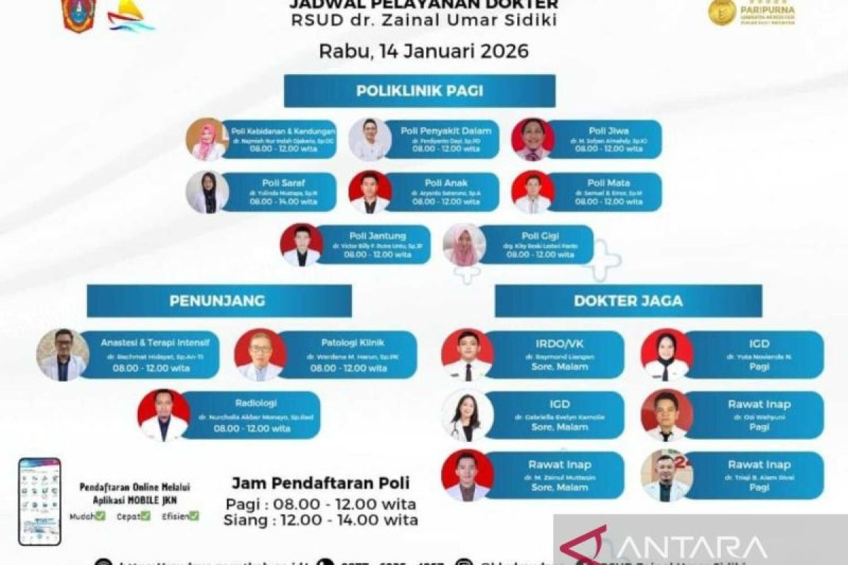Gorontalo (ANTARA) - Rumah Sakit Umum Daerah (RSUD) dr Zainal Umar Sidiki Gorontalo Utara, Provinsi Gorontalo pada Rabu pagi 14 Januari 2026, hanya membuka layanan poliklinik di pagi hari mulai pukul 08.000 hingga pukul 12.00 WITA.