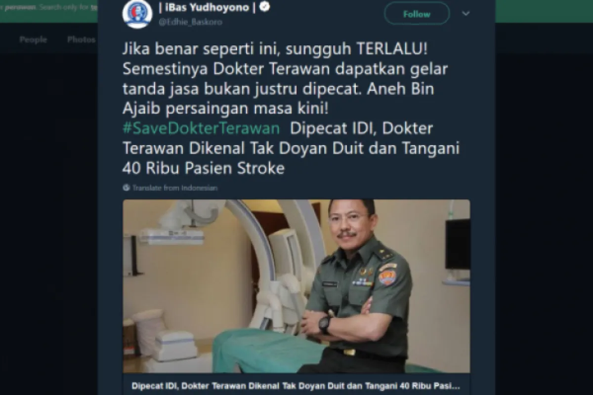 Tangkapan layar cuitan Edhie Baskoro Yudhyono soal Mayor Jenderal TNI dr Terawan Putranto SpRad(K). (ANTARA News/Tangkapan Layar Twitter)