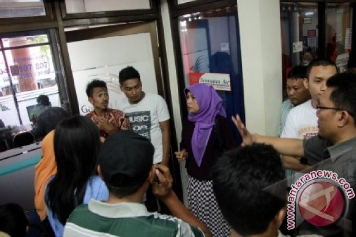 Puluhan penumpang Garuda Airlines mengamuk saat mengetahui bahwa keberangkatan pesawat dari bandara Djalaludin Gorontalo kembali ditunda, Jumat (9/8). Penumpang yang telah menunggu selama tiga hari merasa kesal dengan pernyatan dari pihak Garuda Airlines yang selalu menunda keberangkatan terkait bandara yang belum bisa digunakan sepenuhnya setelah tergelincirnya pesawat Lion Air yang menabrak sapi, Selasa (6/8). FOTO ANTARA/Adiwinata Solihin/ed/ama/13